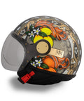Sulla calotta è raffigurato un coinvolgente intreccio di temi geometrici e foglie d'acanto in sfumature di grigio e nero, su cui spiccano i fiori di Zagara e i frutti delle piante di agrumi — arance e limoni — resi in tonalità scure e impreziositi da dettagli in oro. Sul lato sinistro spicca una rappresentazione ridente del Sole, volutamente inserita per esaltare il tema. Il casco jet Magnolia Nero non è solo un dispositivo di sicurezza, ma un oggetto di stile e identità, capace di raccontare la Sicilia vulcanica attraverso forme, simboli e materiali di altissimo livello.