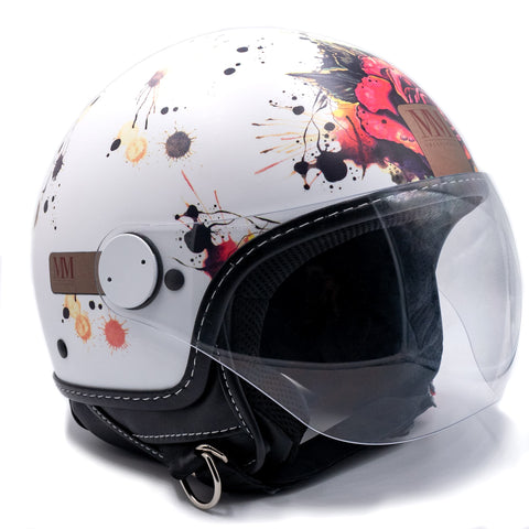Casco jet tattoo rose: grafica floreale street su sfondo bianco e carattere da indossare in città